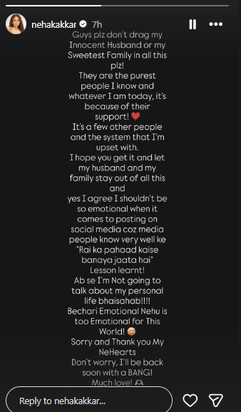 नेहा कक्कड़ ने अपने इंस्टाग्राम स्टोरी में लिखा, प्लीज इन सारे मामलों में मेरे पति और परिवार को ना लाए. वह मेरे जानने वालों में सबसे अच्छे लोग हैं और आज मैं जो कुछ भी हूं, वह उनके सपोर्ट की वजह से ही हूं. मैं कुछ दूसरे लोगों और सिस्टम से नाराज हूं. मुझे उम्मीद है कि आप यह समझेंगे और मेरे पति और मेरे परिवार को इन सब से दूर रखेंगे. मैं मानती हूं कि सोशल मीडिया पर पोस्ट करते समय मुझे इतना इमोशनल नहीं होना चाहिए क्योंकि मीडिया वाले बहुत अच्छे से जानते हैं कि राई का पहाड़ कैसे बनाया जाता है. सबक सीख लिया है. अब से मैं अपनी पर्सनल लाइफ के बारे में बात नहीं करूंगी. बेचारी इमोशनल नेहू इस दुनिया के लिए बहुत ज्यादा इमोशमल है. सॉरी और थैंक यू मेरे नेहूहार्ट्स. चिंता ना करे. मैं जल्द ही ज़ोरदार वापसी करूंगी. बहुत सारा प्यार.”