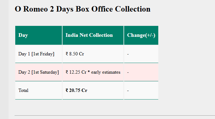 13 फरवरी 2026 को सिनेमाघरों में रिलीज हुई ओ रोमियो ने ओपनिंग डे पर 8.5 करोड़ रुपये का बिजनेस किया था. sacnilk की रिपोर्ट के अनुसार, दूसरे दिन फिल्म ने 12.25 करोड़ रुपये बटोरे. अब कुल कमाई घरेलू बॉक्स ऑफिस पर 20.75 करोड़ रुपये हो गई है. उम्मीद की जा रही है कि रविवार को फिल्म की कमाई और बढ़ेगी.