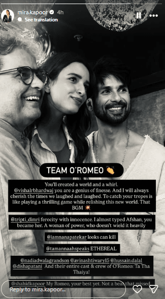 मीरा राजपूत ने अपने इंस्टाग्राम स्टोरी पर शाहिद कपूर, तृप्ति डिमरी और विशाल भारद्वाज की साथ में एक ब्लैक एंड व्हाइट फोटो शेयर की. इसके साथ उन्होंने कैप्शन में ओ रोमियो का रिव्यू करते हुए लिखा, “आपने एक दुनिया और एक तूफान रचा है.विशाल भारद्वाज आपने एक जीनियस की तरह काम किया है और मैं हमेशा उन पलों को संजोकर रखूंगी जो हमने हंसी और आंसुओं के साथ जिए. आपकी शैली को पकड़ना ऐसा है जैसे खेल-खेल में किसी रोमांचक खेल को खेलना, और साथ ही एक नई दुनिया को जीना. तृप्ति आपके अंदर मासूमियत के साथ एक अलग ही ताकत दिखी. मुझे तो सच में अफ्शां से थोड़ी जलन होने लगी थी. तुम पूरी तरह उस किरदार में ढल गई थी. एक मजबूत और दमदार औरत, जिसने पूरी दुनिया को अपने कदमों में कर लिया. शाहिद मेरे रोमियो, अब तक का आपका सबसे बेहतरीन काम. एक भी बीट मिस नहीं हुई.”