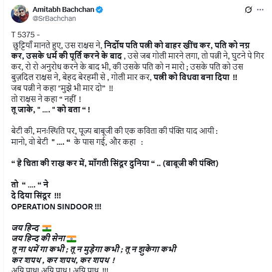 Operation Sindoor : भारत और पाकिस्तान के बीच तनाव जारी है. इस बीच बॉलीवुड एक्टर अमिताभ बच्चन की प्रतिक्रिया पहलगाम आतंकी हमले को लेकर आई है. उन्होंने सोशल मीडिया प्लेटफार्म एक्स पर लिखा–छुट्टियां मानते हुए लोगों को उस राक्षस ने निशाना बनाया. निर्दोष पति पत्नी को बाहर खींच कर, पति को नग्न कर, उसके धर्म की पूर्ति करने के बाद गोली मारी गई. जब गोली मारी जाने लगी, तो पत्नी ने घुटने पे गिर कर, रो–रो अनुरोध किया. उसने अनुरोध किया कि मेरे पति को मत मारो. इसके बाद भी उसके पति को उस बुजदिल राक्षस ने बेहद बेरहमी से गोली मार दी. पत्नी को विधवा बना दिया !!