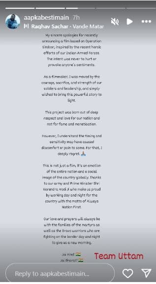 उत्तम माहेश्वरी ने इंस्टाग्राम स्टोरी पर लिखा, “हाल ही में ऑपरेशन सिंदूर पर आधारित एक फिल्म की घोषणा करने के लिए मैं दिल से माफी मांगता हूं. मेरा इरादा कभी भी किसी की भावनाओं को ठेस पहुंचाना या भड़काना नहीं था. मैं हमारे सैनिकों और नेतृत्व के साहस, बलिदान और शक्ति से अभिभूत हूं और बस इस शक्तिशाली कहानी को प्रकाश में लाना चाहता था. हालांकि, मैं समझता हूं कि समय और संवेदनशीलता ने कुछ लोगों को असहज या पीड़ा पहुंचाई होगी. इसके लिए, मुझे गहरा खेद है. यह सिर्फ एक फिल्म नहीं है, यह पूरे देश की भावना है और वैश्विक स्तर पर देश की एक सामाजिक छवि है. हमारा प्यार और प्रार्थनाएं हमेशा शहीदों के परिवारों के साथ-साथ उन बहादुर योद्धाओं के साथ रहेंगी, जो हमें एक नई सुबह देने के लिए दिन-रात सीमा पर लड़ रहे हैं.”