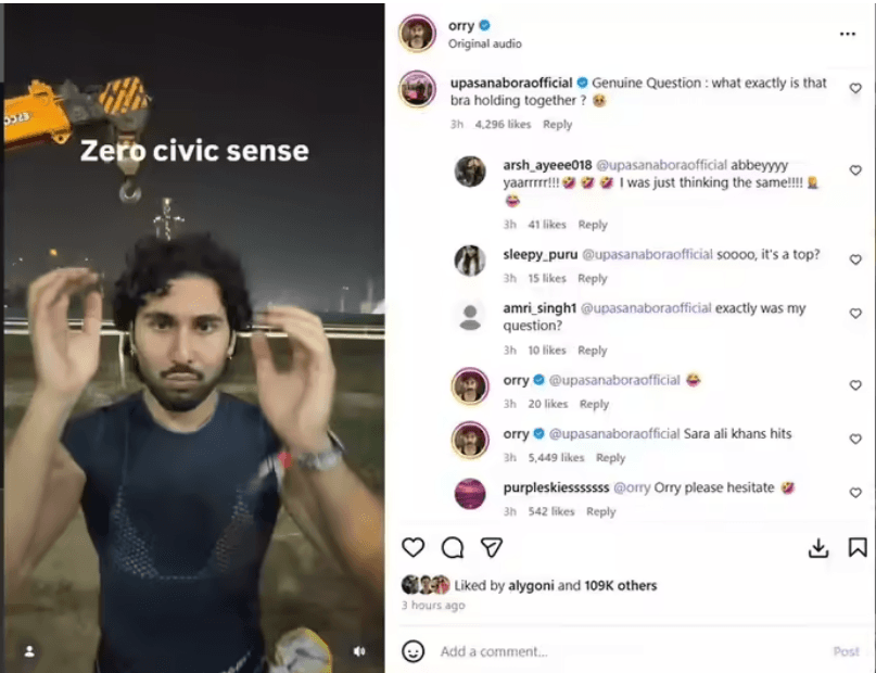 सोमवार, 26 जनवरी को ओरी ने एक रील शेयर की, जिसमें वह बड़े ग्राउंड में शूट करते दिखे. वीडियो में उन्होंने डेनिम के साथ ब्रा और ट्रांसपेरेंट टी-शर्ट पहनी थी. इसी वीडियो पर एक यूजर ने पूछा कि ब्रा ने आखिर क्या होल्ड किया है. इस पर ओरी ने रिप्लाई किया, “सारा अली खान की हिट फिल्में.” इस कमेंट ने इंटरनेट पर हड़कंप मचा दिया.