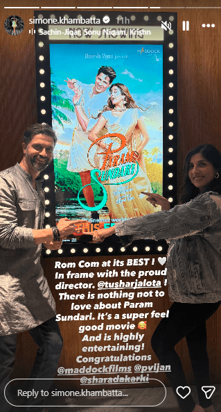मुंबई में फिल्म परम सुंदरी का 28 अगस्त को स्पेशल स्क्रीनिंग रखा गया. इसमें सोशल मीडिया पर्सनालिटी, ब्लॉगर सिमोन खंबाटा भी शामिल हुई. उन्होंने फिल्म देखने के बाद इसका रिव्यू करते हुए अपने इंस्टाग्राम स्टोरी पर लिखा, “केमिस्ट्री 15/10. रोम-कॉम अपनी बेस्ट पर. इस फ्रेम में नजर आ रहे हैं प्राउड डायरेक्टर तुषार जलोटा. परम सुंदरी में ऐसा कुछ भी नहीं है जो आपको पसंद न आए. यह एक सुपर फील-गुड मूवी है और बेहद एंटरटेनिंग भी.” आगे उन्होंने अपने दूसरे पोस्ट में लिखा, ”मुझे कहना होगा कि जाह्नवी कपूर पहले कभी इतनी खूबसूरत नहीं लगीं. तुषार जलोटा, आपने सिद्धार्थ मल्होत्रा और जाह्नवी कपूर की जोड़ी को स्क्रीन पर जादुई, मजेदार और खूबसूरत बना दिया है. दोस्तों, ये फिल्म जरूर देखें.”