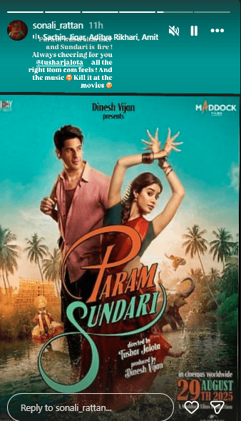 सिस्टेंट डायरेक्टर सोनाली रतन देशमुख ने भी फिल्म परम सुंदरी का रिव्यू किया है. उन्होंने अपने इंस्टाग्राम पर लिखा, “परम एक चार्मर है और सुंदरी तो आग है. हमेशा तुम्हारे लिए चीयर करती हूं तुषार जलोटा. पूरे रोम-कॉम वाले फील्स आ रहे हैं और म्यूजिक तो कमाल है. सिनेमाघरों में धमाल मचाओ.”