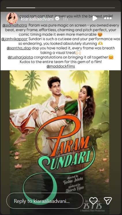 बॉलीवुड एक्ट्रेस कियारा आडवाणी ने अपनी इंस्टाग्राम स्टोरीज पर परम सुंदरी का एक पोस्टर शेयर किया. उन्होंने कैप्शन में लिखा, “अ फील गुड रोमांटिक कॉमेडी, जो आपके चेहरे पर एक बड़ी मुस्कान ला देती है. परम के रूप में @sidmalhotra पर्दे पर जादू फैला रहे थे, आपने वाकई हर बीट, हर फ्रेम पर कब्जा किया. आपकी कॉमिक टाइमिंग ने मूवी को यादगार बना दिया.”