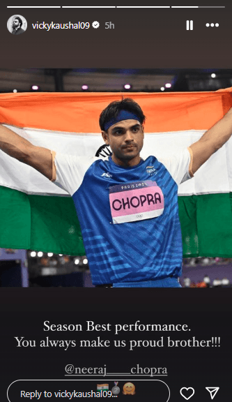 विक्की कौशल ने इंस्टाग्राम स्टोरी पर नीरज चोपड़ा को बधाई देते हुए उनकी फोटो लगाकर लिखा, “सीजन का बेस्ट परफॉर्मेंस. आप हमेशा हमें गौरवान्वित करते हैं भाई.” वहीं, मलाइका अरोड़ा ने नीरज चोपड़ा का वीडियो क्लिप पोस्ट कर लिखा, “मेरे भारत के लिए यह कितना गर्व का क्षण है. इस ऐतिहासिक पल को मैंने लाइव देखा.” इसके अलावा सनी देओल ने लिखा, पेरिस ओलंपिक 2024 में रजत और कांस्य पदक जीतने पर नीरज चोपड़ा और भारतीय हॉकी टीम पर बहुत गर्व है. गोल्डन मैन नीरज, आप हमारे देश का गौरव हैं, जिसने तिरंगा फहराया है.