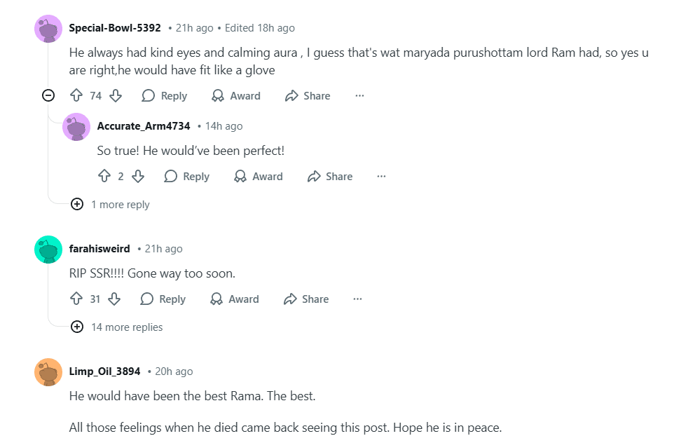 टीजर के बाद से ही रणबीर कपूर की कास्टिंग को लेकर मिली-जुली प्रतिक्रिया मिल रही है. रेडिट और ट्विटर जैसे प्लेटफॉर्म पर लोग सुशांत की AI तस्वीरों को रणबीर से बेहतर बता रहे हैं. एक यूजर Special-Bowl-5392 ने कमेंट करते हुए लिखा, उनकी आंखों में हमेशा एक चमक और चेहरे पर बहुत शांति रहती थी. मुझे लगता है कि भगवान राम का स्वभाव भी वैसा ही शांत रहा होगा, इसलिए आप सही कह रहे हैं, सुशांत इस रोल के लिए एकदम सही होते. एक फैन AdRelevant6649 ने इमोशनल होते हुए लिखा कि, मुझसे अपने आंसू रोके नहीं जा रहे हैं. वहीं कुछ लोग शास्त्रों का हवाला देते हुए सांवले रंग पर भी बहस कर रहे हैं हालांकि ये बहस सिर्फ एक कल्पना है क्योंकि सुशांत अब हमारे बीच नहीं हैं, लेकिन उनकी इन तस्वीरों ने इंटरनेट पर तहलका मचा रखा है.