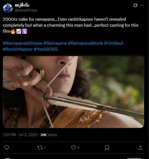 एक यूजर ने रामायण का अनाउंसमेंट वीडियो देखकर लिखा, “”रामायण के लिए 2000 करोड़ का केक…रणबीर कपूर ने भी पूरी तरह से खुलासा नहीं किया है, लेकिन इस आदमी में क्या आकर्षण था…इस फिल्म के लिए एकदम सही कास्टिंग.” एक दूसरे यूजर ने लिखा, “रामायण पहली 3000 करोड़ की फिल्म लोड हो रही है. आशाजनक लग रही है, नितेश तिवारी की रामायण देखने के लिए उत्साहित हूं.” एक अन्य यूजर ने लिखा, ”रामायण की झलक एक भव्य-महाकाव्य का वादा करती है, दो भागों (2026/2027) के साथ बड़े पर्दे पर आती है.”