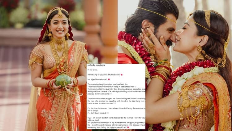 रश्मिका मंदाना ने शादी की तस्वीरों को शेयर करते हुए लिखा, ”हाय मेरे प्यारों, अब आपको मिलवाती हूं “मेरे पति” से! 💘 श्री विजय देवरकोंडा!! ❤️ वो शख्स जिसने मुझे सच्चे प्यार का मतलब बताया,