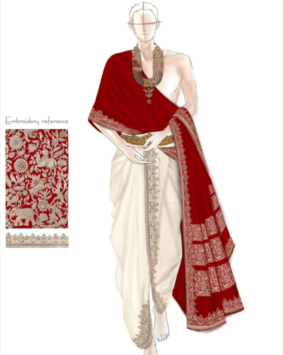 विजय देवरकोंडा ने इस शादी में आईवरी धोती के साथ विविड वर्मिलियन अंगवस्त्रम पहना, जो उनके लुक में ट्रेडिशनल टच दे रहा था. अंगवस्त्रम पर मंदिर और जंगल की प्रेरित कढ़ाई ने आउटफिट को शानदार बनाया. इस लुक को पारंपरिक सोने के आभूषण, पवित्र धागे और ताजगी भरी जैस्मीन की माला के साथ पूरा किया गया, जिससे उनकी उपस्थिति और भी भव्य नजर आई.