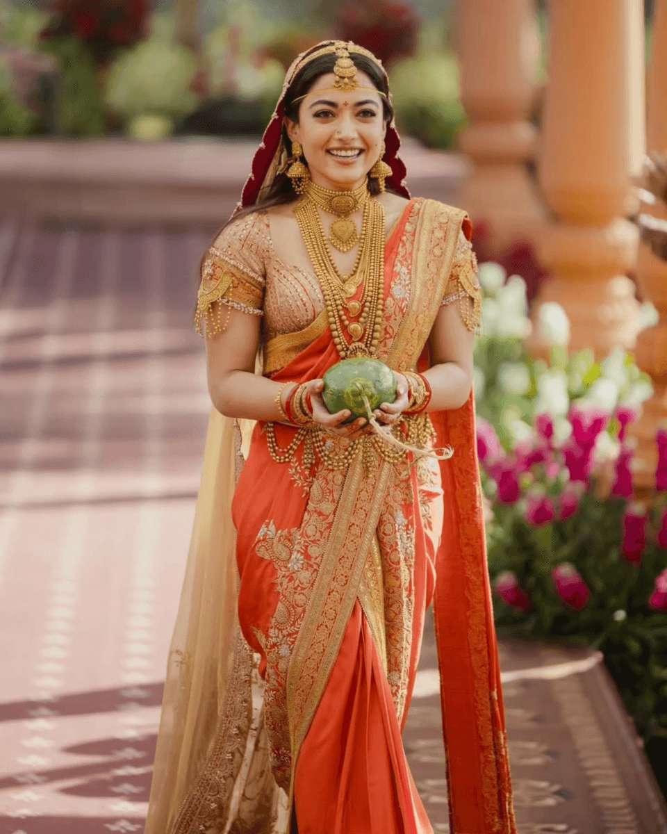 रश्मिका मंदाना की ग्लोइंग रस्ट-ऑरेंज साड़ी