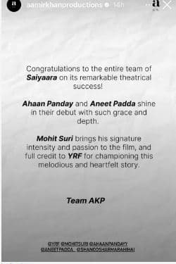 आमिर खान प्रोडक्शंस ने अपनी इंस्टाग्राम स्टोरीज पर सैयारा की टीम के लिए बधाई संदेश शेयर किया. इसमें लिखा था, “सैयारा की पूरी टीम को ब्लॉकब्टर सफलता के लिए बधाई! अहान पांडे और अनीत पड्डा अपनी पहली फिल्म में इतनी शालीनता और गहराई के साथ चमकते हैं. मोहित सूरी अपनी विशिष्ट तीव्रता और जुनून फिल्म में लाते हैं और इस मधुर और भावपूर्ण कहानी को आगे बढ़ाने के लिए वाईआरएफ को पूरा श्रेय जाता है.” बीते दिनो रणवीर सिंह, आलिया भट्ट, शरवरी, अनिल कपूर, वरुण धवण, श्रद्धा कपूर और मधुर भंडारकर ने जमकर तारीफ की थी.