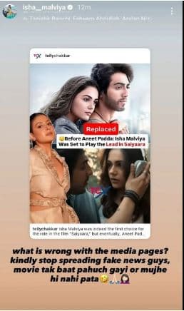 ईशा मालवीय ने इंस्टाग्राम स्टोरी पर एक पोस्ट किया. जिसमें उन्होंने सैयारा फिल्म से रिप्लेस होने पर बात की. एक्ट्रेस ने हैरान जताते हुए कहा, “मीडिया पेजों को क्या हो गया है? कृपया फर्जी खबरें फैलाना बंद करें दोस्तों, फिल्म तक बात पहुंच गई और मुझे ही नहीं पता.”