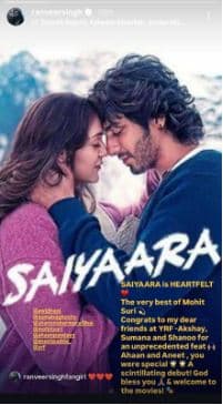रणवीर सिंह ने इंस्टाग्राम स्टोरीज पर सिनेमाघरों में रिलीज हुई फिल्म “सैयारा” का रिव्यू किया. उन्होंने मोहित सूरी के काम की तारीफ की और निर्माता अक्षय विधानी, सुमना घोष और कास्टिंग डायरेक्टर शानू शर्मा को बधाई दी. रणवीर ने लिखा, “सैयारा दिल को छू लेने वाली है (लाल दिल वाला इमोजी) मोहित सूरी का सर्वश्रेष्ठ काम… वाईआरएफ के मेरे प्यारे दोस्तों- अक्षय, सुमना और शानू को इस अभूतपूर्व उपलब्धि के लिए बधाई (हाई-फाइव इमोजी).” इसके बाद उन्होंने “सैयारा” के कलाकारों की तारीफ करते हुए लिखा, “अहान और अनीत, आप खास थे. एक शानदार शुरुआत! ईश्वर आपका भला करे और फिल्मों में आपका स्वागत है.”