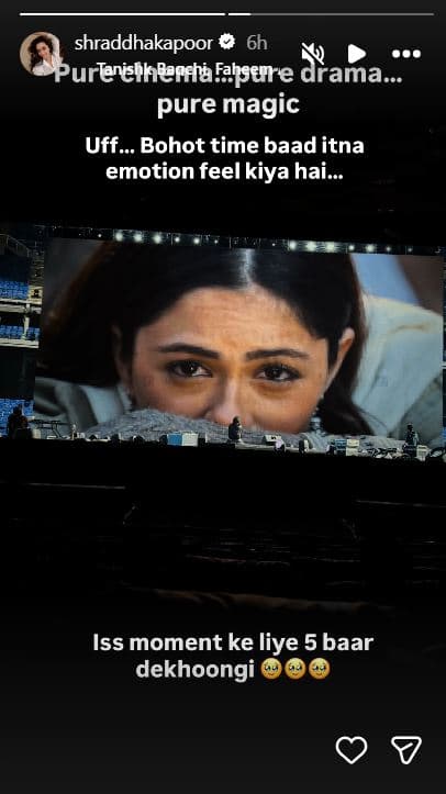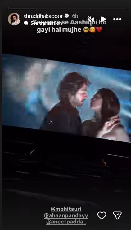 श्रद्धा कपूर ने अपनी इंस्टाग्राम स्टोरीज पर थिएटर से एक वीडियो क्लिप शेयर की, जिसमें वह “सैयारा” देख रही थीं. उन्होंने अहान पांडे, अनीत पड्डा और मोहित सूरी को टैग करते हुए लिखा, “सैयारा से आशिकी हो गई है मुझे.” एक और स्टोरी में, उन्होंने लिखा कि यह फिल्म ‘पूरी तरह से जादू’ है और बहुत लंबे समय के बाद किसी फिल्म को देखकर उन्हें इतना गहरा एहसास हुआ. उफ्फ…बहुत समय बाद इतना इमोशन फील किया है.