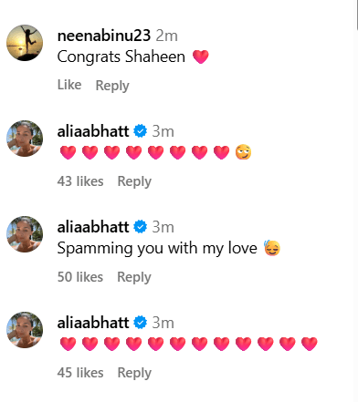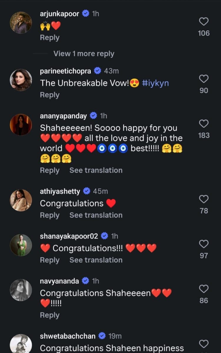 शाहीन की इस खुशी में पूरा बॉलीवुड शामिल हुआ है.शाहीन भट्ट की सगाई की पोस्ट पर बॉलीवुड सितारों ने जमकर प्यार लुटाया है. अर्जुन कपूर और परिणीति चोपड़ा ने अपनी खुशी जाहिर करते हुए उन्हें बधाई दी, जहां परिणीति ने इसे ‘एक अटूट वादा’ बताया. अनन्या पांडे ने काफी इमोशनल होते हुए लिखा कि वे शाहीन के लिए बहुत खुश हैं और उन्हें दुनिया की सारी खुशियां मिलें. इनके अलावा अथिया शेट्टी, शानाया कपूर, नव्या नंदा और श्वेता बच्चन ने भी कमेंट सेक्शन में दिल वाले इमोजी बनाकर इस जोड़े को सुनहरे भविष्य के लिए ढेर सारी शुभकामनाएं दीं.