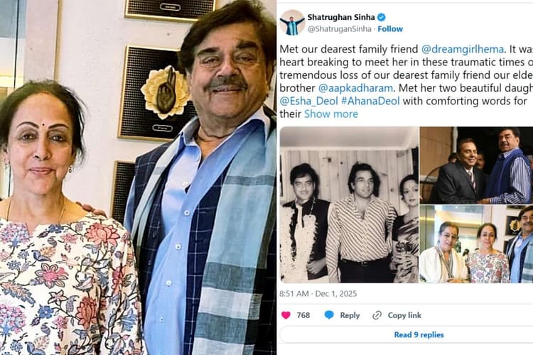 शत्रुघ्न सिन्हा ने एक्स पर अपनी पत्नी पूनम सिन्हा और हेमा मालिनी के साथ एक तस्वीर साझा करते हुए लिखा कि धर्मेंद्र के निधन के बाद इन कठिन क्षणों में हेमा जी से मिलना बेहद दिल तोड़ देने वाला था. उन्होंने बताया कि हेमा मालिनी के साथ उनकी बेटियां- ईशा देओल और अहाना देओल भी मौजूद थीं. उन्होंने कहा कि धर्मेंद्र सिर्फ एक महान कलाकार ही नहीं, बल्कि एक दयालु और उदार इंसान थे, जिनकी यादें हमेशा जीवित रहेंगी.