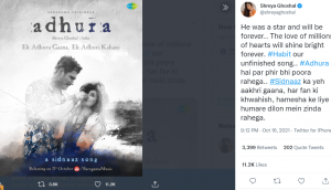 श्रेया ने अपने ट्टिवटर हैंडल पर अधूरा सॉन्ग का पोस्टर शेयर करते हुए एक इमोशनल नोट भी लिखा है जिसके अनुसार ‘वो स्टार थे और हमेशा रहेंगे. लाखों दिलों का प्यार हमेशा चमकता रहेगा. हैबिट हमारा अधूरा सॉन्ग #Adhura है पर फिर भी पूरा रहेगा. सिडनाज का यह आखिरी गाना, हर फैन की ख्वाहिश है और हमेशा के लिए हमारे दिलों में जिंदा रहेगा.’ श्रेया के इस पोस्ट को ट्विटर पर खूब रीट्विट किया जा रहा है.