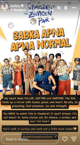 आमिर खान की लेटेस्ट रिलीज फिल्म ‘सितारे जमीन पर’ का ‘तारे जमीन पर’ स्टार दर्शील सफारी ने एक इमोशनल पोस्ट लिखा है. दर्शील ने तारे जमीन पर में ईशान अवस्थी का किरदार निभाया था. अब एक्टर ने फिल्म का पोस्टर अपने इंस्टा स्टोरी पर शेयर करते हुए लिखा, “मेरा दिल अब और भी भरा-भरा, नरम और खुश महसूस कर रहा है. ये फिल्म बहुत ही खूबसूरती, दिल से और हल्के-फुल्के अंदाज में हमें हमारी असलियत दिखाती है. इसमें ना कोई दया है, ना कोई ज्ञान की बातें-बस मौजूदगी, मेहनत और ताकत की बात है. आपको ये फिल्म थिएटर में जरूर देखनी चाहिए. ये स्ट्रीमिंग के लिए नहीं बनी है. कुछ कहानियां बस बड़े पर्दे, एक चुप माहौल और आपके पूरे दिल की मांग करती हैं.