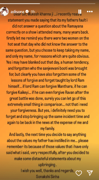 मुकेश खन्ना की बातों पर सोनाक्षी सिन्हा ने उन्हें करारा जवाब देते हुए अपने इंस्टा स्टोरी पर लिखा, डियर सर, मुकेश खन्ना जी, मैंने हाल ही एक बयान पढ़ा था कि जिसमें आपने कहा गया था कि यह मेरे पिता की गलती है कि मैंने एक शो में रामायण के बारे में एक सवाल का सही जवाब नहीं दिया. इस शो का हिस्सा मैं कई साल पहले हुई थी. आपको याद दिला दूं कि उस दिन हॉट सीट पर मेरे साथ दो और महिलाएं थी और उन्हें भी इसका आंसर नहीं मालूम था. लेकिन आप सिर्फ हर वक्त मेरा नाम लेते रहते हैं.