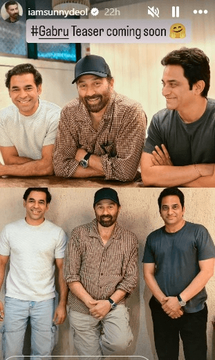 Gabru Teaser: बॉलीवुड एक्टर सनी देओल ने अपनी आने वाली फिल्म ‘गबरू’ को लेकर बड़ा अपडेट दिया है. उन्होंने सोशल मीडिया पर एक बिहाइंड द सीन तस्वीर शेयर की, जिसमें उनके साथ फिल्म के निर्माता विशाल राणा और निर्देशक शशांक उदापुरकर नजर आ रहे हैं. इंस्टाग्राम स्टोरी पर फोटो पोस्ट कर उन्होंने कैप्शन में लिखा, “#गबरू का टीजर जल्द आ रहा है.” इस ऐलान ने ही फैंस के बीच उत्साह बढ़ा दिया है.
