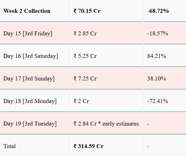 अब सैकनिल्क की शुरुआती रिपोर्ट के अनुसार फिल्म ने रिलीज के 19वें दिन यानी तीसरे मंगलवार को 2.84 करोड़ रुपये का कलेक्शन किया है. इसी के साथ फिल्म की कुल कमाई 314.59 करोड़ रुपये तक पहुंच गई है.