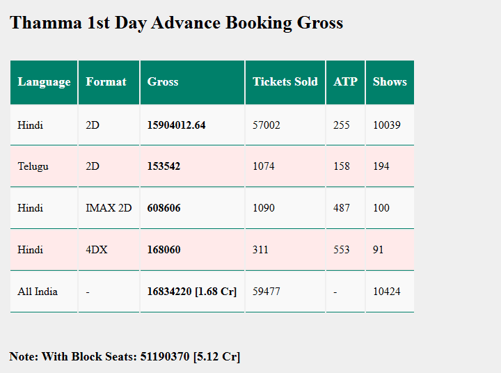 हॉरर-कॉमेडी फिल्म ‘थामा’ ने पहले दिन की एडवांस बुकिंग में 10424 शोज में 59477 टिकट बेच डाले है और अबतक 1.68 करोड़ रुपये का बिजनेस किया है. ब्लॉक सीट्स से फिल्म ने 5.12 करोड़ रुपये का कलेक्शन किया है. हालांकि ये कलेक्शन और बढ़ने की उम्मीद है. ट्रेंड एक्सपर्ट्स के अनुसार, फिल्म 15-20 करोड़ रुपये की कमाई पहले दिन कर सकती है.