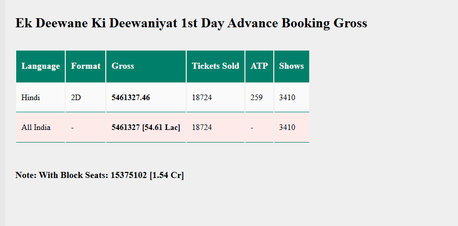 सैकनिल्क के अनुसार, एक दीवाने की दीवानियत ने अब तक भारत में सिर्फ 54.61 लाख रुपये का कलेक्शन किया है. ब्लॉक सीट्स को मिलाकर मूवी ने फिलहाल 1.54 करोड़ रुपये का बिजनेस किया है. ये नंबर्स अभी और बढ़ेंगे क्योंकि मूवी के रिलीज होने में अभी वक्त है.