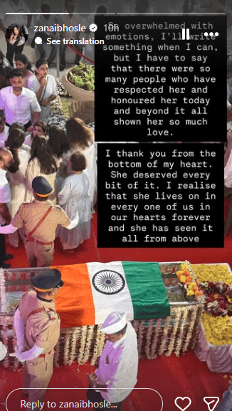अंतिम संस्कार के बाद जनाई भोसले ने इंस्टाग्राम पर अपनी भावनाएं साझा की. उन्होंने एक तस्वीर पोस्ट करते हुए लिखा, “मैं भावनाओं से पूरी तरह भर गई हूं, मैं कुछ लिखूंगी जब कर पाऊंगी, लेकिन मुझे कहना है कि आज और उसके बाद भी इतने सारे लोगों ने उनका सम्मान किया और उन्हें इतना प्यार दिया. मैं दिल से आप सभी का धन्यवाद करती हूं. वह इस सबकी पूरी हकदार थीं. मुझे एहसास हुआ है कि वह हम सबके दिलों में हमेशा जिंदा हैं और ऊपर से सब देख रही हैं.”