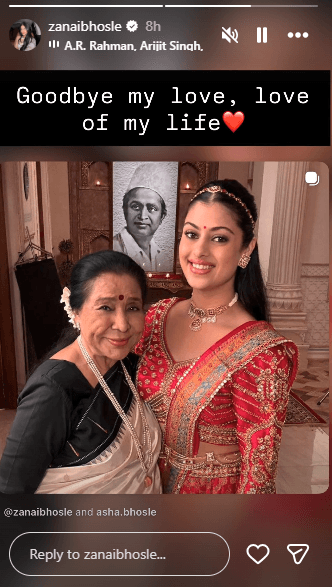 जनाई भोसले ने अपने इंस्टा स्टोरी पर दादी आशा भोसले के साथ एक तस्वीर पोस्ट कर लिखा, गुडबाय माय लव. लव ऑफ माय लाइफ. इसके साथ दिल वाला इमोजी भी उन्होंने बनाया.