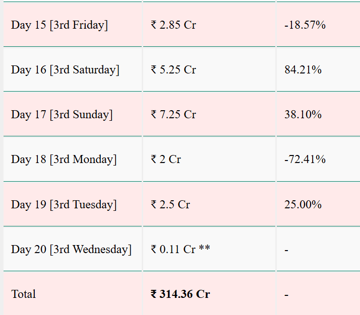 तीसरे वीकेंड पर फिल्म की कमाई में अच्छा उछाल देखने को मिला था. तीसरे शनिवार को फिल्म ने करीब 5.25 करोड़ रुपये और रविवार को 7.25 करोड़ रुपये की कमाई की थी. वहीं सोमवार को कलेक्शन गिरकर 2 करोड़ रुपये रह गया, जबकि मंगलवार को फिर हल्की बढ़त के साथ 2.5 करोड़ रुपये का कारोबार हुआ.