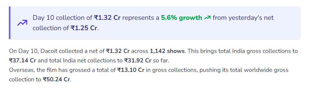 Dacoit box office collection day 10: फिल्म डकैत 10 अप्रैल को सिनेमाघरों में रिलीज हुई है. फिल्म रिलीज के बाद से ही बॉक्स ऑफिस पर ठीक-ठाक कमाई कर रही है. अब वीकेंड होने के वजह से ‘डकैत’ की कमाई में बढ़ोतरी देखने को मिली ही, जो वीकडे के मुकाबले ज्यादा कमाई है. Sacnilk के आंकड़ों के अनुसार, फिल्म ने अपनी रिलीज के 10वें दिन यानी दूसरे रविवार को भारत में करीब 1.32 करोड़ रुपये का नेट कलेक्शन किया है. वहीं शनिवार को फिल्म ने 1.25 करोड़ कमाए थे, जिसके मुकाबले रविवार को 5.6 प्रतिशत की थोड़ी सी बढ़त दर्ज की गई. अगर पिछले 10 दिनों की कुल कमाई देखें, तो भारत में फिल्म का नेट कलेक्शन अब तक 31.92 करोड़ रुपये तक ही पहुंच पाया है. भारत में फिल्म की कुल ग्रॉस कमाई 37.14 करोड़ रुपये हुई है.