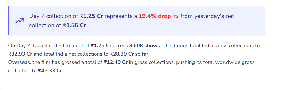 ‘डकैत’ की कुल बजट 70 करोड़ है, लेकिन एक हफ्ता पूरा होने पर भी यह 30 करोड़ का आंकड़ा पार नहीं कर सकी है. फिल्म ने अब तक अपनी लागत का आधा हिस्सा भी वसूल नहीं किया है. आज 17 अप्रैल को अक्षय कुमार की फिल्म ‘भूत बंगला’ रिलीज हो गई है, जिसके कारण ‘डकैत’ के पास अब कमाई करने का मौका बहुत कम बचा है.