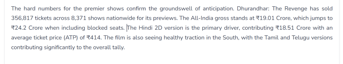 दिलचस्प बात यह है कि फिल्म के पेड प्रीव्यू शो के लिए टिकटों की बिक्री इतनी तेज हो रही है कि ट्रेड एक्सपर्ट्स पहले ही इसे बड़ी ओपनिंग वाली फिल्म बता रहे हैं. ट्रेड वेबसाइट सैकनिल्क की रिपोर्ट के अनुसार, आज यानी 13 मार्च सुबह 10 बजे तक पूरे देश में फिल्म के लगभग 8371 शो के लिए 3 लाख 56 हजार 817 टिकट बिक चुके हैं. एडवांस बुकिंग के जरिए फिल्म ने बिना ब्लॉक सीटों के करीब 19.01 करोड़ रुपये का कलेक्शन कर लिया है. वहीं अगर ब्लॉक सीटों को भी जोड़ दिया जाए तो यह आंकड़ा लगभग 24.2 करोड़ रुपये तक पहुंच चुका है. ऐसे में फिल्म की रिकॉर्ड ओपनिंग की उम्मीद की जा रही है.