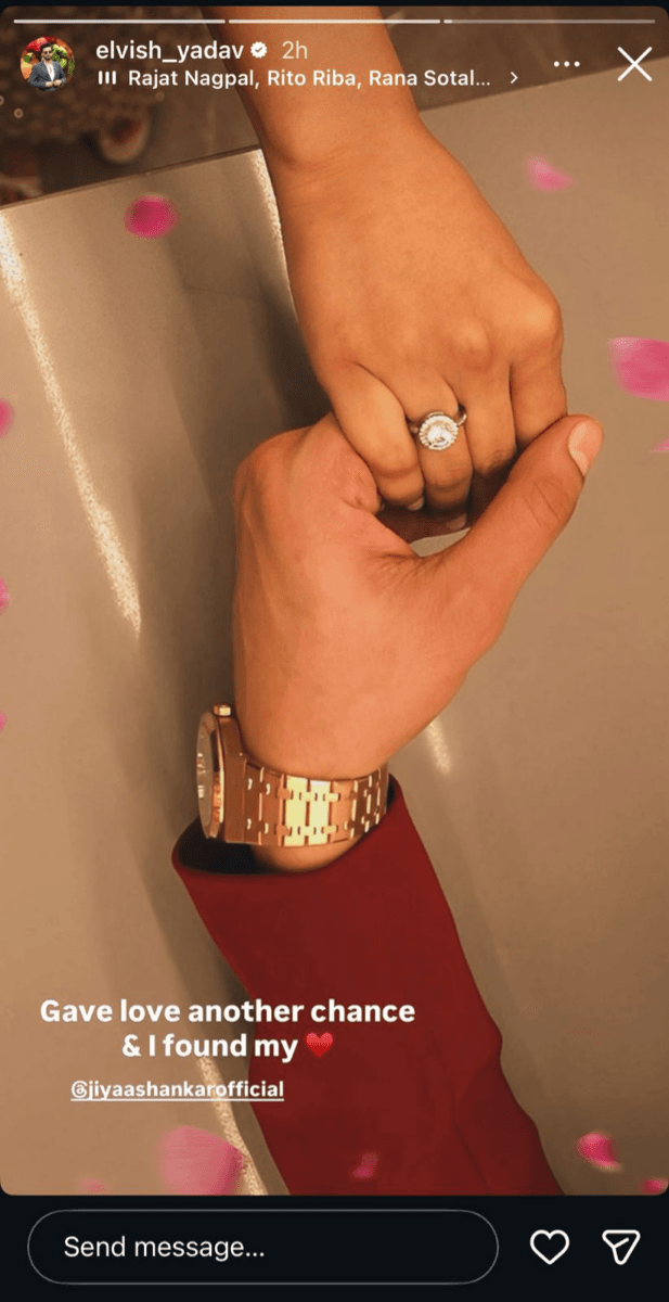 इस पोस्ट में एल्विश ने जिया शंकर को टैग भी किया, जिससे चर्चाओं को और हवा मिल गई. इसके बाद जिया ने उसी स्टोरी को रीशेयर करते हुए सिर्फ एक ❤️ इमोजी लगाया. बस फिर क्या था- सोशल मीडिया पर कयासों का दौर शुरू हो गया. कुछ लोगों ने इसे सगाई का इशारा माना, तो कुछ ने इसे किसी ब्रांड प्रमोशन या अपकमिंग प्रोजेक्ट का हिस्सा बताया.