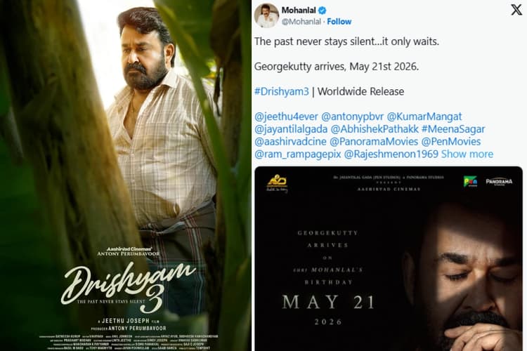 फिल्म के लीड एक्टर Mohanlal ने खुद सोशल मीडिया प्लेटफॉर्म एक्स पर इसकी जानकारी दी. उन्होंने बताया कि दृश्यम 3 अब 21 मई 2026 को दुनियाभर के सिनेमाघरों में रिलीज होगी. दिलचस्प बात यह है कि इसी दिन मोहनलाल का जन्मदिन भी होता है, जिससे यह रिलीज और भी खास बन गई है. अपने पोस्ट में उन्होंने लिखा कि अतीत कभी खत्म नहीं होता, वह सिर्फ सही समय का इंतजार करता है.
