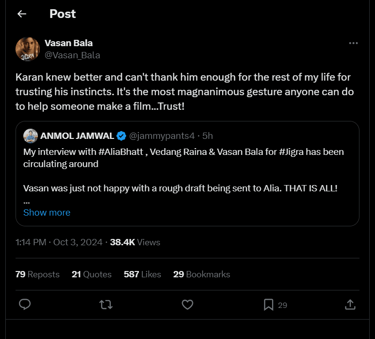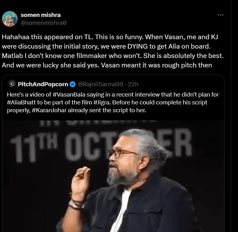 सोमन मिश्रा ने सोशल मीडिया पर वीडियो पोस्ट किया है साथ ही कैप्शन में लिखा है कि यह एक वीडियो है जिसमें वसन बाला द्वारा दिए गए एक इंटरव्यू है. जिसमें उन्होंने आलिया भट्ट को फिल्म जिगरा का हिस्सा बनाने की योजना नहीं बनाई थी. सबसे पहले कि वह अपनी फिल्म की स्क्रिप्ट ठीक से पूरी कर पाते, करण ने पहले ही स्क्रिप्ट उन्हें भेज दी. ‘हाहाहाहा यह टीएल पर दिखाई दिया. यह बहुत मज़ेदार है. जब वसन मैं और केजे शुरुआती कहानी पर चर्चा कर रहे थे इस दौरान हम आलिया को लेने के लिए बेताब थे. और हम भाग्यशाली थे कि उसने हां कहा.