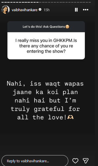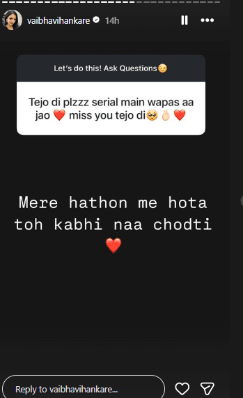 वैभवी हंकारे से सवाल-जवाब सेशन के दौरान कई फैंस ने सवाल पूछे. एक फैन ने एक्ट्रेस से कहा, तेजो दी प्लीज सीरियल में वापस आ जाओ. मिस यू तेजो दी. इसपर एक्ट्रेस ने रिप्लाई करते हुए लिखा, मेरे हाथों में होता तो कभी नहीं छोड़ती. एक यूजर ने उनसे पूछा, आपको गुम है किसी के प्यार में बहुत मिस करता है. कोई चांस हो दोबारा शो में जाने का. इसपर वैभवी ने कहा, नहीं, इस वक्त वापस जाने का कोई प्लान नहीं है. वैभवी के जवाब से साफ है कि उनकी वापसी गुम है किसी के प्यार में संभव नहीं है.