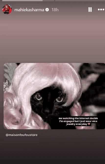 हालांकि, अब माहिका ने खुद इन अफवाहों पर ब्रेक लगा दिया है. उन्होंने इंस्टाग्राम स्टोरी पर एक फनी पोस्ट शेयर करते हुए इन अफवाहों को क्लियर किया. उनके पोस्ट में एक बिल्ली पिंक विग पहने नजर आ रही थी और उसके साथ लिखा था, “इंटरनेट देखकर मुझे भी पता चला कि मेरी सगाई हो गई है. लेकिन सच ये है कि मैं रोज अच्छे ज्वेलरी पहनती हूँ.” यानी एक्ट्रेस ने साफ कर दिया है कि उनके हाथ में दिख रही डायमंड रिंग सिर्फ एसेसरी थी, एंगेजमेंट रिंग नहीं.