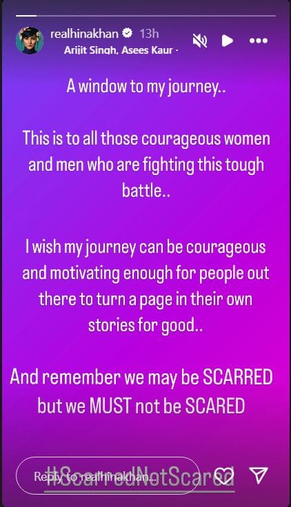 हिना खान ने अपनी इंस्टाग्राम स्टोरीज पर कहा कि उन्हें उम्मीद है कि उनकी ‘जर्नी दूसरों के लिए साहसी और प्रेरक’ हो सकती है. एक्ट्रेस ने लिखा, “मेरी जर्नी… यह उन सभी साहसी महिलाओं और पुरुषों के लिए है जो इस कठिन बीमारी से लड़ रहे हैं.. मैं चाहती हूं कि मेरी जर्नी साहसी और इतनी प्रेरक हो कि लोग इससे पॉजिटिविटी ले सके और अपनी कहानियों का एक पन्ना पलट सकें. याद रखें कि हम चोटिल हो सकते हैं, लेकिन हमें डरना नहीं चाहिए.”