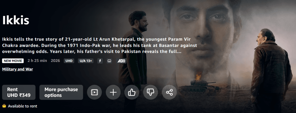 इक्कीस (2026) अब Prime Video पर उपलब्ध है. आप इसे तुरंत रेंट पर देख सकते हैं, जिसकी कीमत 349 रुपए है. वहीं, 26 फरवरी से यह Prime Video के सभी सब्सक्राइबर्स के लिए फ्री में उपलब्ध हो जाएगा. इसके अलावा, OTTplay Premium के सब्सक्राइबर्स इसे टॉप-अप ऑप्शन के साथ भी आसानी से देख सकते हैं.