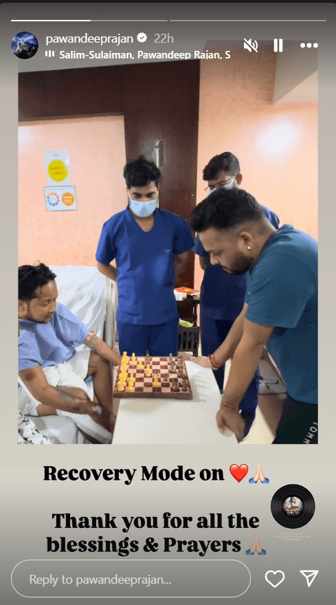 हादसे के बाद पवनदीप को अस्पताल में भर्ती कराया गया, जहां उनके कई ऑपरेशन हुए. अब उनकी तबीयत में तेजी से सुधार हो रहा है और वह रिकवरी मोड में हैं. उनकी टीम लगातार उनकी हेल्थ अपडेट्स शेयर कर रही है. हाल ही में पवनदीप ने खुद अपने इंस्टाग्राम पर एक स्टोरी शेयर की, जिसमें वह अस्पताल के स्टाफ के साथ शतरंज खेलते नजर आ रहे हैं. उन्होंने लिखा– “रिकवरी मोड ऑन, आपके आशीर्वाद के लिए शुक्रिया.”