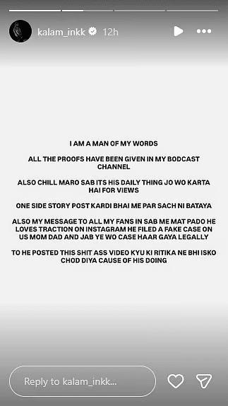 इन पोस्ट के साथ-साथ कलाम ने अपनी इंस्टाग्राम स्टोरी में भी एक लंबा नोट साझा किया. उन्होंने लिखा, “मैं अपनी बात पर कायम रहने वाला इंसान हूं. सारे सबूत मैंने अपने पॉडकास्ट चैनल पर दे दिए हैं. आप लोग भी शांत रहें क्योंकि वह अक्सर व्यूज पाने के लिए ऐसा करता रहता है. उसने सिर्फ अपनी तरफ की कहानी पोस्ट की है, लेकिन पूरी सच्चाई नहीं बताई. मेरे सभी फैंस के लिए मेरा एक मैसेज है कि आप लोग इन सब मामलों में मत पड़िए. उसे इंस्टाग्राम पर ज्यादा ध्यान और चर्चा पाना पसंद है. उसने मम्मी-पापा और हम लोगों के खिलाफ झूठा केस किया था, लेकिन जब वह कानूनी तौर पर वह केस हार गया, तब उसने यह वीडियो डाल दिया. साथ ही उसकी अपनी हरकतों की वजह से ऋतिका भी उसे छोड़कर चली गई.”