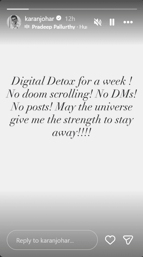 करण जौहर ने जैसे ही इस बात का ऐलान किया सोशल मीडिया पर उनके फैंस की प्रतिक्रियाएं आने लगीं. ज्यादातर लोगों ने उनके फैसले को सही बताया और कहा कि कभी-कभी डिजिटल ब्रेक लेना जरूरी हो जाता है. करण ने अपने इंस्टा स्टोरी में मजाकिया अंदाज में लिखा, “एक हफ्ते का डिजिटल डिटॉक्स! न डूम स्क्रॉलिंग, न डीएम्स, न पोस्ट्स! भगवान बस दूर रहने की ताकत दे दें.”
