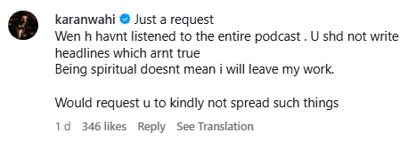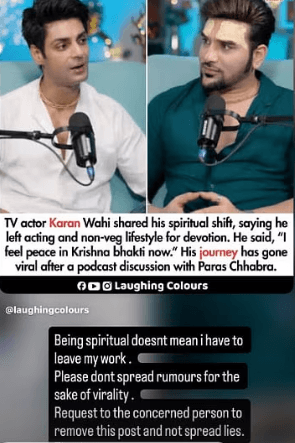 जब यह झूठ हद से ज्यादा बढ़ने लगा, तो करण वाही ने खुद चुप्पी तोड़ी. उन्होंने सोशल मीडिया पर इस अफवाह का स्क्रीनशॉट शेयर किया और नाराजगी जाहिर की. करण ने साफ कहा, “आध्यात्मिक होने का यह मतलब बिल्कुल नहीं है कि मैं अपना काम छोड़ दूं. सिर्फ व्यूज पाने के लिए झूठ मत फैलाइए.” उन्होंने गुजारिश की कि इस तरह की गलत खबरें न फैलाई जाएं, क्योंकि वो अभी भी एक्टिंग कर रहे हैं.