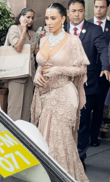 अनंत-राधिका के शुभ आशीर्वाद फंक्शन के लिए किम और क्लोई कार्दर्शियन ने डिजाइनर तरुण तहिलियानी की डिजाइन की हुई बेज कलर की साड़ी पहनी किम कार्दर्शियन ने इसके साथ फुल स्लीव्ड डीप नेक ब्लाउज पहना था और उनकी खूबसूरती बेहद आकर्षक थी. उन्होंने अपने लुक को हैवी डायमंड नेकलेस, इयररिंग्स, मांग टीका और नथनी के साथ पूरा किया. इस दौरान उन्होंने अपने बालों को स्लिक बैक स्टाइल में बांधा रखा था.