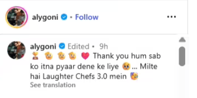 फिनाले में टीम कांटा ने टीम छुरी को रोमांचक मुकाबले में हराया. टीम छुरी में करण कुंद्रा, एल्विश यादव, तेजस्वी प्रकाश, ईशा मालविया, विवियन डीसेना, ईशा सिंह, गुरमीत चौधरी और देबिना बैनर्जी शामिल थे. अली गोनी ने जीत के बाद इंस्टाग्राम पर फैंस का धन्यवाद किया और लिखा, “Thank you hum sab ko itna pyaar dene ke liye 🥹… Milte hai Laughter Chefs 3.0 mein.”