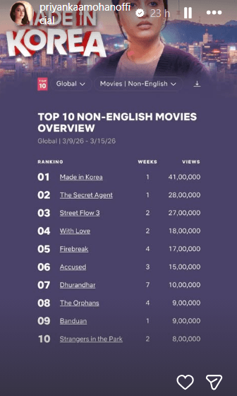 जहां ‘मेड इन कोरिया’ नंबर 1 पर है, वहीं हिंदी फिल्म ‘अभियुक्त’ 1.5 मिलियन व्यूज के साथ छठे स्थान पर है. इसके अलावा धुरंधर, जिसमें रणवीर सिंह नजर आते हैं, वह भी टॉप 10 में बना हुआ है और पहले भी नंबर 1 पर रह चुका है.