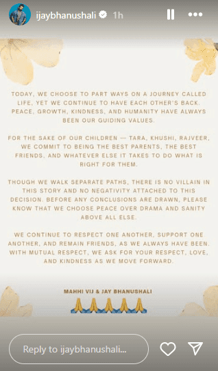 माही और जय ने यह भी साफ किया कि उनके अलगाव के पीछे कोई विवाद या नकारात्मकता नहीं है. नोट में आगे लिखा गया, “इस कहानी में कोई विलेन नहीं है. हम ड्रामा की बजाय शांति और समझदारी को चुनते हैं.” नोट के अंत में दोनों ने एक-दूसरे के लिए सम्मान और सपोर्ट बनाए रखने की बात कही और फैंस से भी प्यार, सम्मान और दया की उम्मीद जताई.