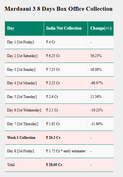 मर्दानी 3 की रफ्तार पर लगी ब्रेक, बॉक्स ऑफिस पर 8वें दिन धड़ाम हुई मूवी, जानिए लेटेस्ट कलेक्शन